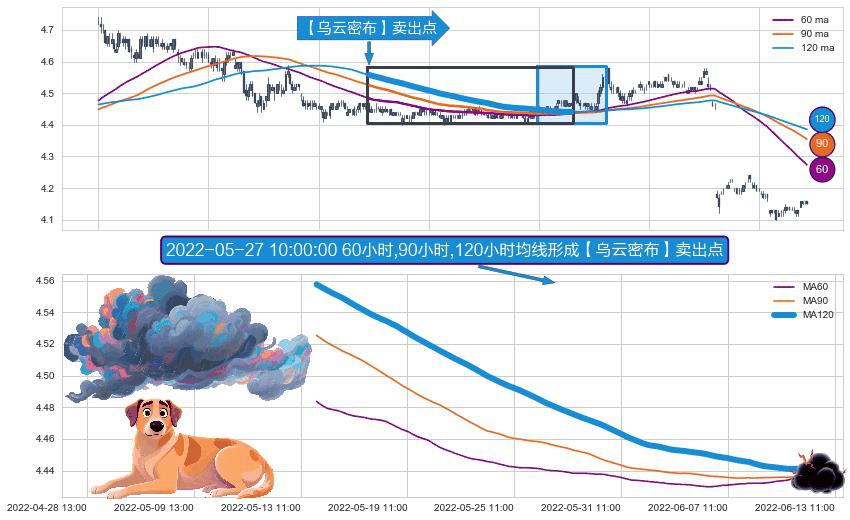 形态多维评估: ⚀ 2022-05-16 09:00:00小时-2022-06-10 11:00:00小时显现 60小时-90小时-120小时均线 【乌云密布】卖出点 看空信号,后市看跌,卖出