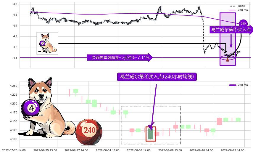 形态多维评估: ⚀ 2022-08-03 14:00:00-小时显现 葛兰威尔均线 240小时均线 第④买入点 下降趋势均值回复的短线反弹信号,后市看涨,买进信号
