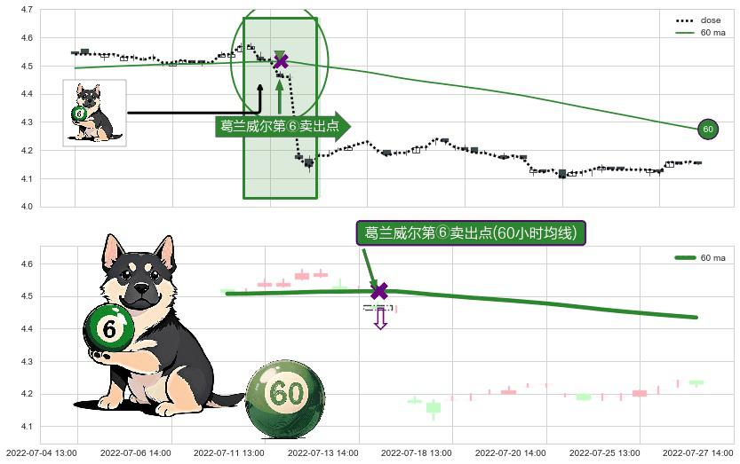 形态多维评估: ⚀ 2022-07-14 13:00:00-小时显现 葛兰威尔均线 60小时均线 第⑥卖出点 走势反转见顶信号,后市看跌,卖出信号