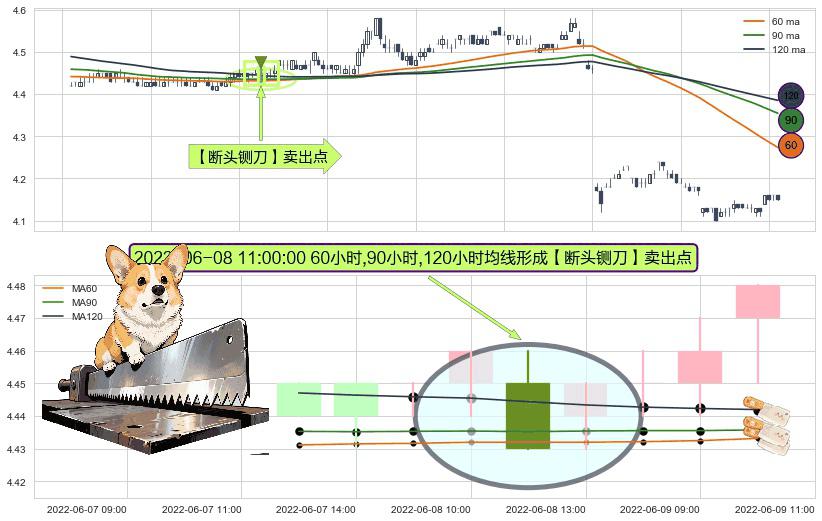 形态多维评估: ⚀ 2022-06-08 11:00:00小时显现 60小时-90小时-120小时均线 【断头铡刀】卖出点 看空信号,后市看跌,卖出