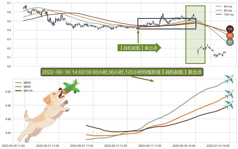 形态多维评估: ⚀ 2022-06-06 13:00:00小时-2022-07-13 14:00:00小时显现 60小时-90小时-120小时均线 【战机起航】卖出点 看空信号,后市看跌,卖出