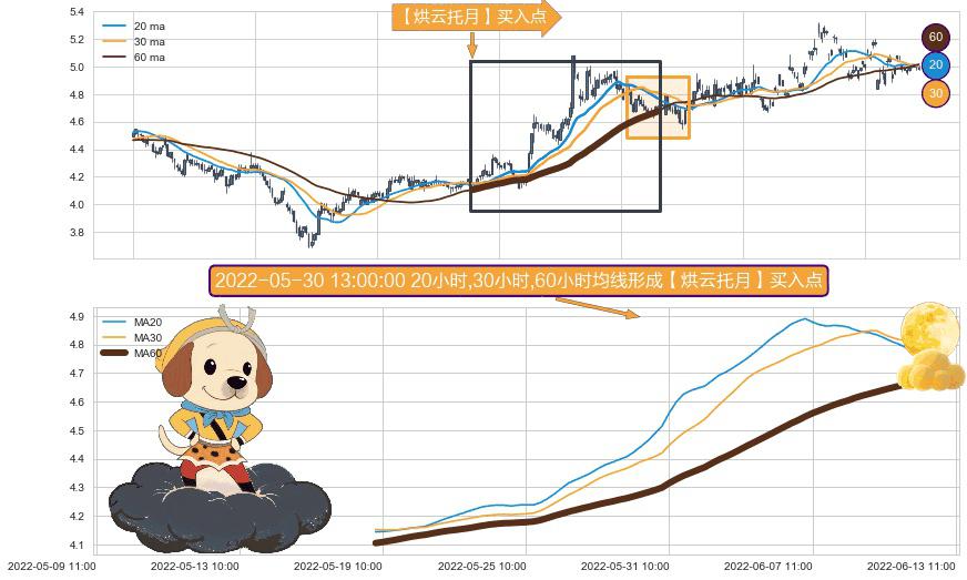 ⚀ 2022-05-19 09:00:00小时-2022-06-10 11:00:00小时显现 20小时-30小时-60小时均线 【烘云托月】买入点 看多信号,后市看涨,买入