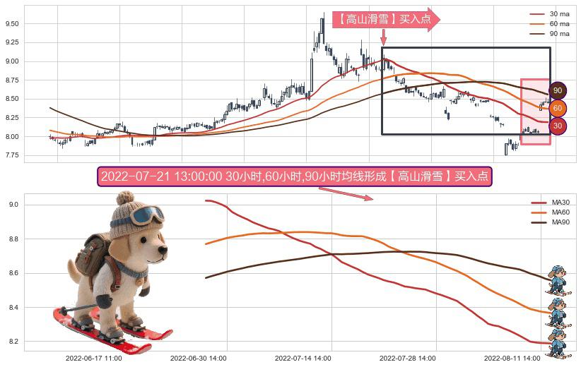 ⚀ 2022-06-28 14:00:00小时-2022-08-12 14:00:00小时显现 30小时-60小时-90小时均线 【高山滑雪】买入点 看多信号,后市看涨,买入