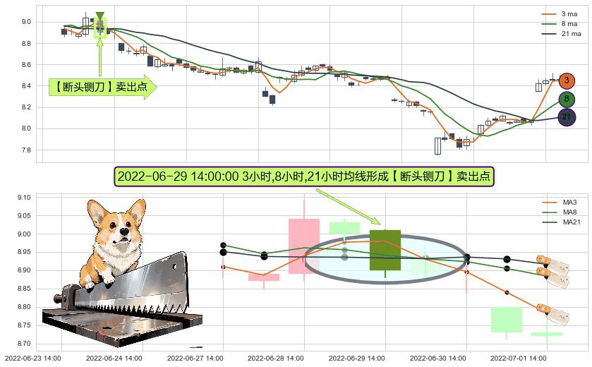 ⚀ 2022-06-29 14:00:00小时显现 3小时-8小时-21小时均线 【断头铡刀】卖出点 看空信号,后市看跌,卖出