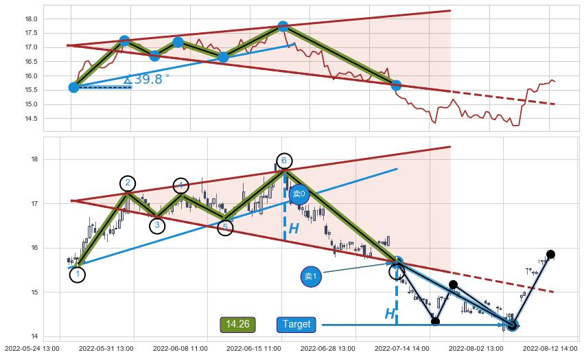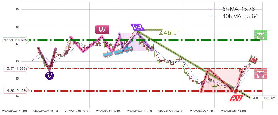 ➣ 2022-06-15 13:00-2022-08-05 13:00下跌趋势存在反转上涨[机会],其原下跌趋势的阻力位(13.87)已被突破[强支撑信号],原下跌趋势角度: 46.1˚