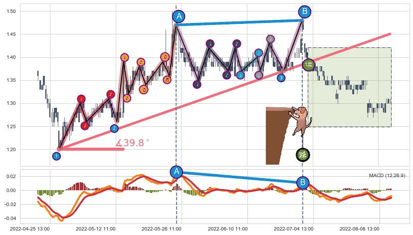➢ 最后的上涨趋势2022-04-27 09:00至2022-07-01 13:00:存在破位迹象,后续小调整或者反转下跌