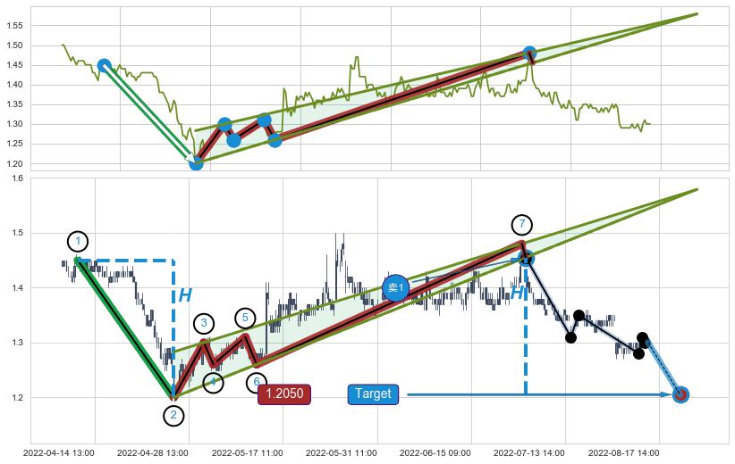 ➢ 最小反转跌幅→𝐇: 0.148333 (逐步抬高阻力斜边最后的阻力点⑥与支撑边垂直距离)