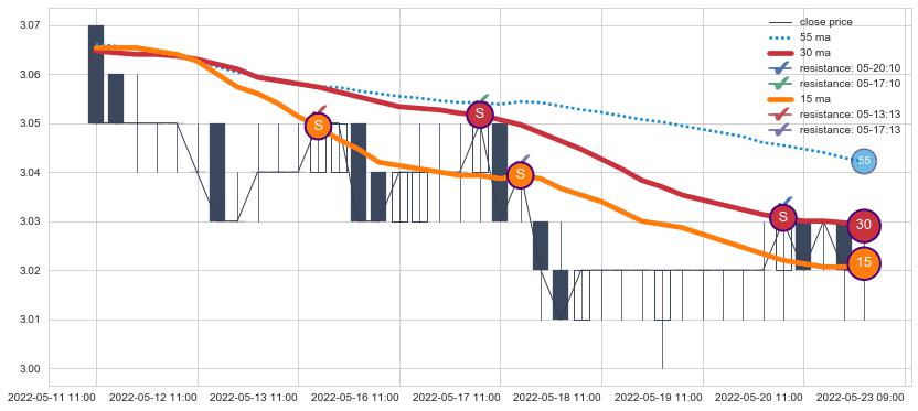 下跌趋势05-11 11:00-05-23 09:00,均线30, 15确认关键阻力4处