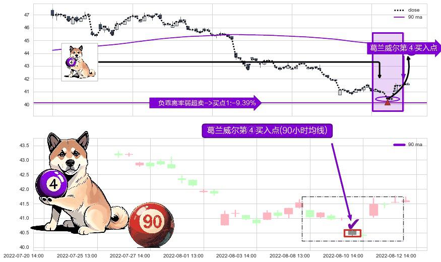 ⚀ 2022-08-10 13:00:00-小时显现 葛兰威尔均线 90小时均线 第④买入点 下降趋势均值回复的短线反弹信号,后市看涨,买进信号