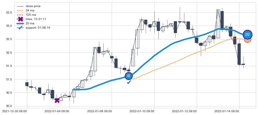 ⚂ 2022-06-14 13:00:00小时突然冒出一根大阳线,一下子顶穿三条均线且收盘价收在各条均线之上