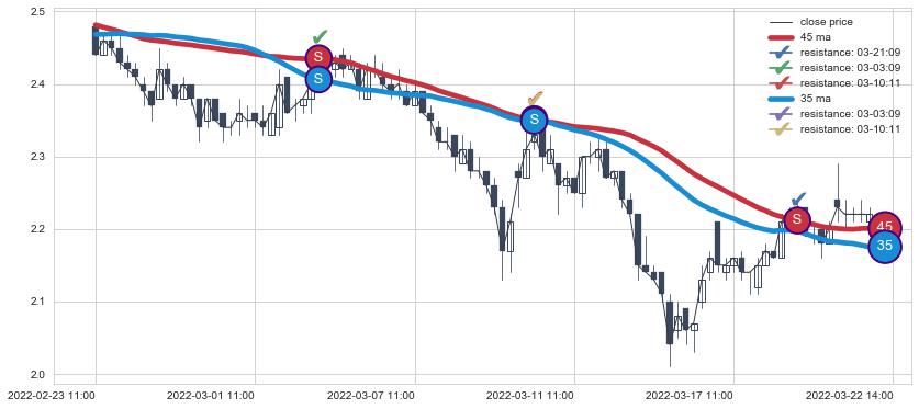 下跌趋势02-23 11:00-03-22 14:00,均线35, 45确认关键阻力3处