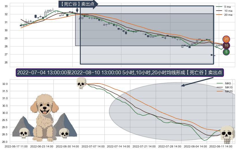 形态多维评估: ⚀ 2022-07-04 14:00:00-小时至2022-08-10 13:00:00-小时显现 5小时-10小时-20小时均线 【死亡谷】卖出点 看空信号,后市看跌,卖出