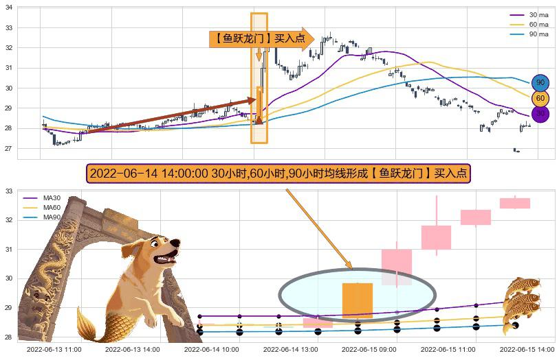 形态多维评估: ⚀ 2022-06-14 14:00:00小时显现 30小时-60小时-90小时均线 【鱼跃龙门】买入点 看多信号,后市看涨,买入
