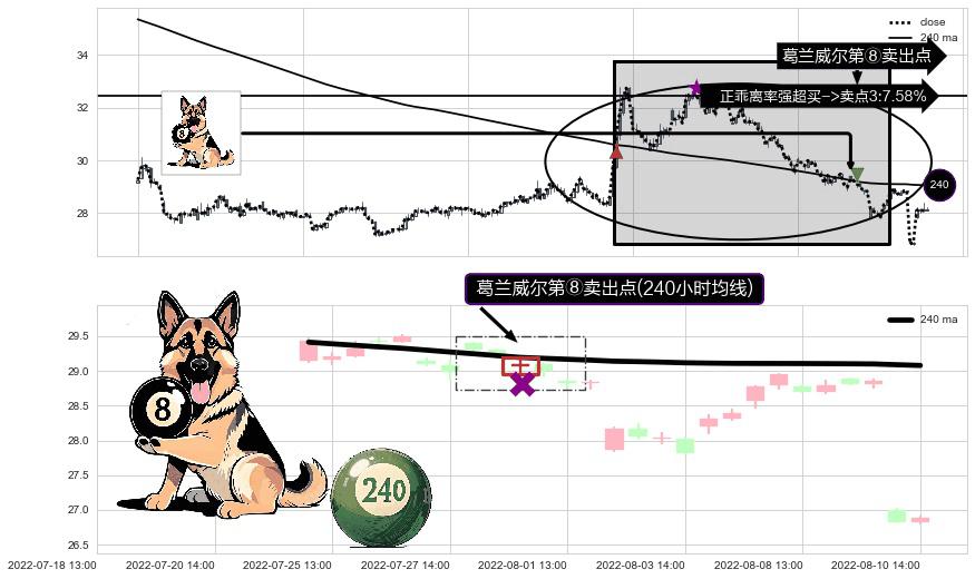 形态多维评估: ⚀ 2022-07-29 13:00:00-小时显现 葛兰威尔均线 240小时均线 第⑧卖出点 下降趋势的中继信号,后市看跌,卖出信号