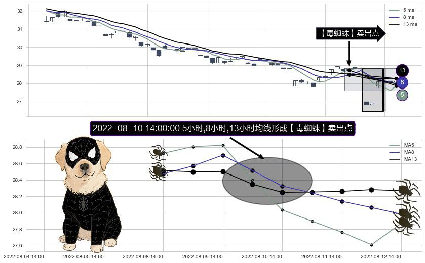 形态多维评估: ⚀ 2022-08-10 14:00:00小时显现 5小时-8小时-13小时均线 【毒蜘蛛】卖出点 看空信号,后市看跌,卖出