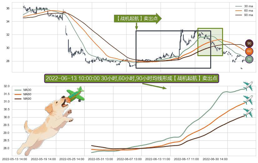形态多维评估: ⚀ 2022-05-26 13:00:00小时-2022-07-08 14:00:00小时显现 30小时-60小时-90小时均线 【战机起航】卖出点 看空信号,后市看跌,卖出