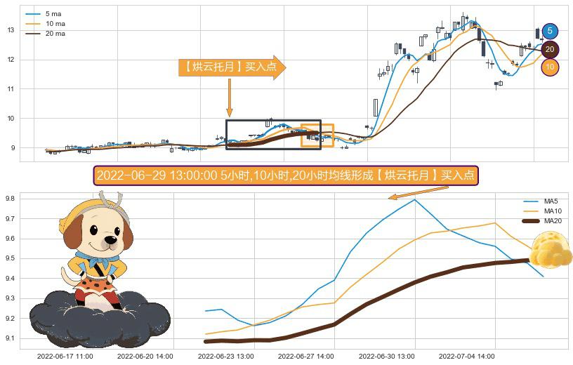 形态多维评估: ⚀ 2022-06-21 14:00:00小时-2022-07-06 13:00:00小时显现 5小时-10小时-20小时均线 【烘云托月】买入点 看多信号,后市看涨,买入