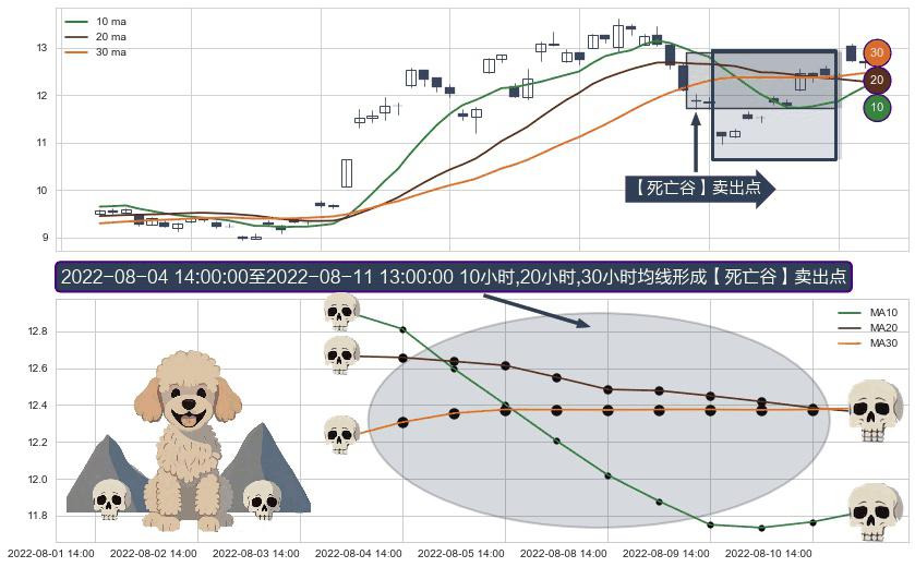 形态多维评估: ⚀ 2022-08-05 13:00:00-小时至2022-08-11 13:00:00-小时显现 10小时-20小时-30小时均线 【死亡谷】卖出点 看空信号,后市看跌,卖出