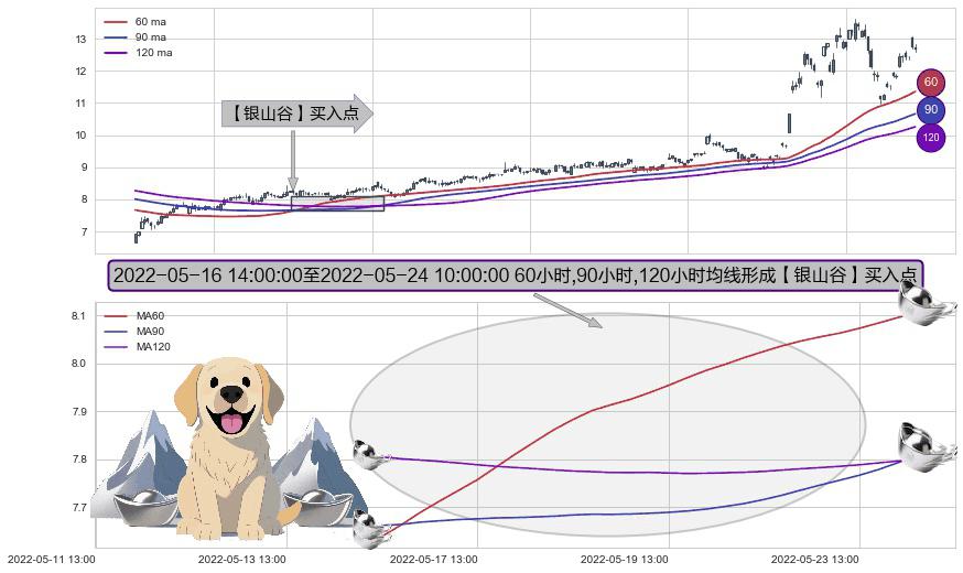 形态多维评估: ⚀ 2022-05-17 09:00:00-小时至2022-05-24 10:00:00-小时显现 60小时-90小时-120小时均线 【银山谷】买入点 看多信号,后市看涨,买入