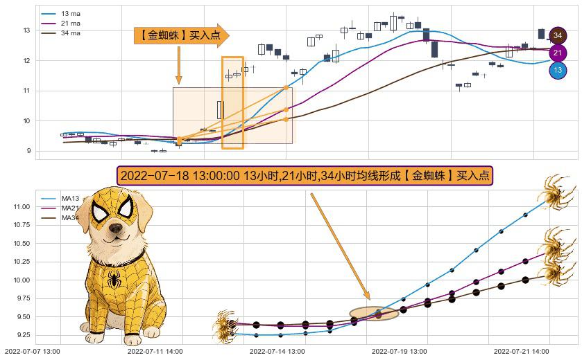 形态多维评估: ⚀ 2022-07-18 13:00:00小时显现 13小时-21小时-34小时均线 【金蜘蛛】买入点 看多信号,后市看涨,买入