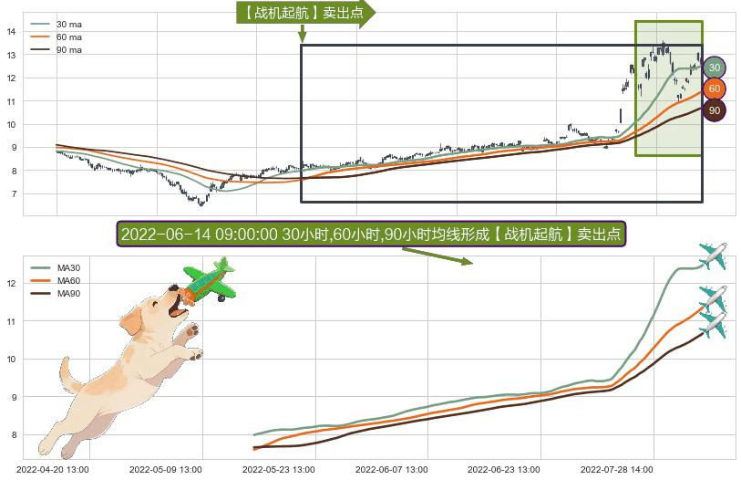 形态多维评估: ⚀ 2022-05-16 10:00:00小时-2022-08-12 14:00:00小时显现 30小时-60小时-90小时均线 【战机起航】卖出点 看空信号,后市看跌,卖出