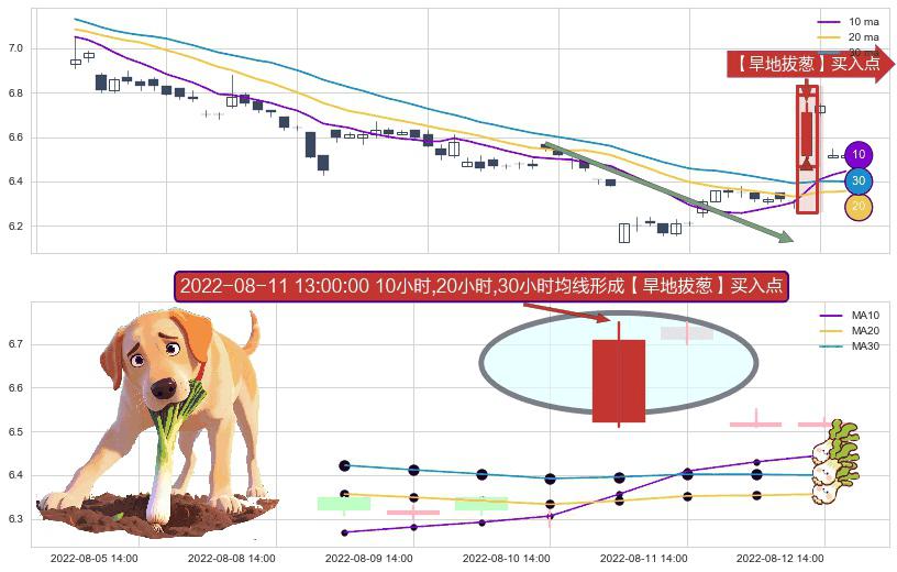 形态多维评估: ⚀ 2022-08-11 13:00:00小时显现 10小时-20小时-30小时均线 【旱地拔葱】买入点 看多信号,后市看涨,买入