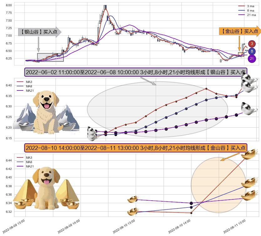形态多维评估: ⚀ 2022-08-11 13:00:00-小时至2022-08-11 13:00:00-小时显现 3小时-8小时-21小时均线 【金山谷】买入点 其再次确认了买入信号,可靠性更强,买入