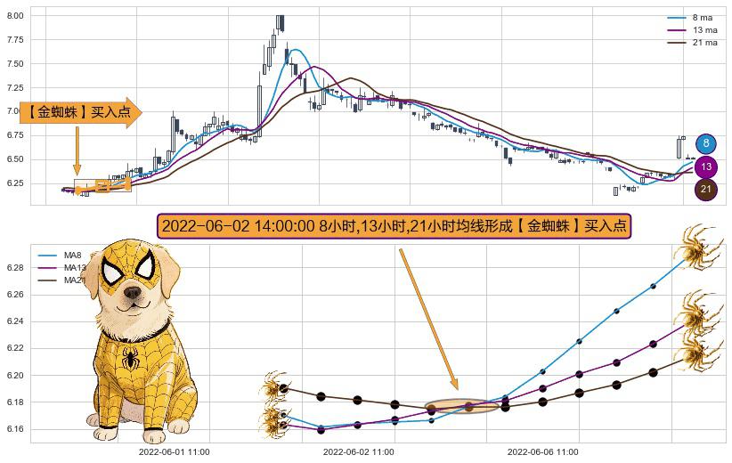 形态多维评估: ⚀ 2022-06-02 14:00:00小时显现 8小时-13小时-21小时均线 【金蜘蛛】买入点 看多信号,后市看涨,买入
