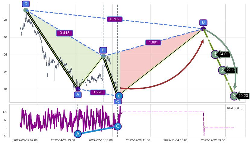 ➣ D点拟合预测价格26.98,距离最后交易收盘价格20.11相差 +34.17%