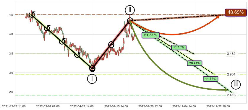 ➢ 循环浪继续向下【最高】位置(11-03:09, 3.485),匹配聚类样本比例21.73%, 可能性概率11.15%
