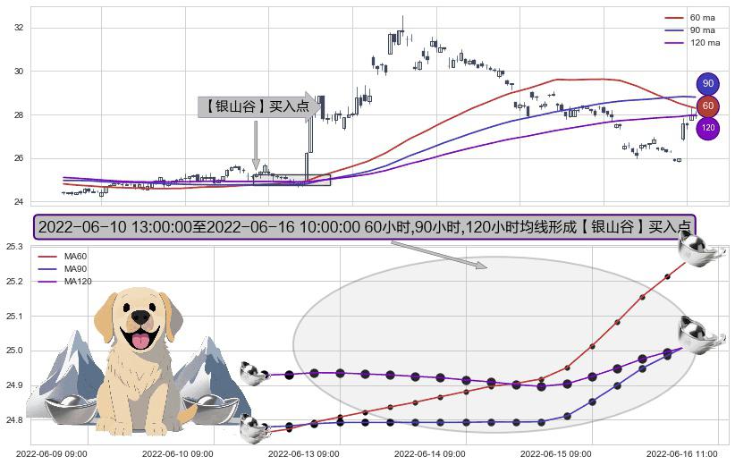 形态多维评估: ⚀ 2022-06-10 14:00:00-小时至2022-06-16 10:00:00-小时显现 60小时-90小时-120小时均线 【银山谷】买入点 看多信号,后市看涨,买入