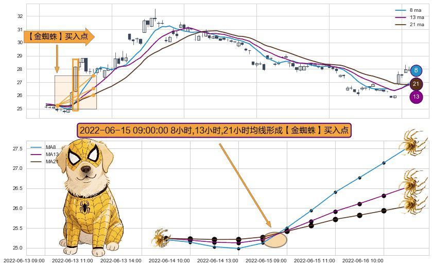 形态多维评估: ⚀ 2022-06-15 09:00:00小时显现 8小时-13小时-21小时均线 【金蜘蛛】买入点 看多信号,后市看涨,买入