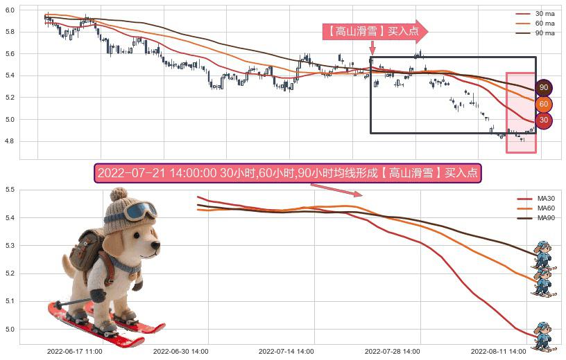 ⚀ 2022-06-29 14:00:00小时-2022-08-12 14:00:00小时显现 30小时-60小时-90小时均线 【高山滑雪】买入点 看多信号,后市看涨,买入