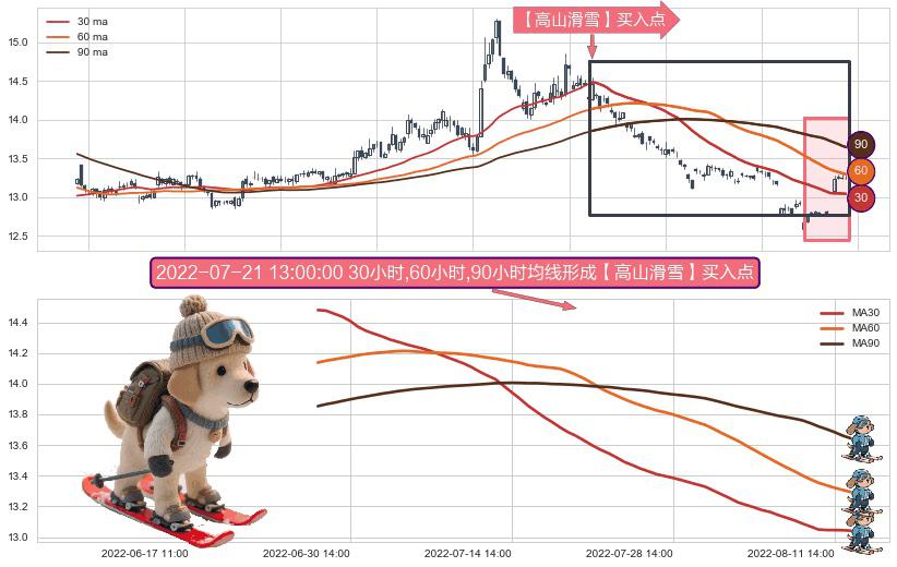 形态多维评估: ⚀ 2022-06-28 14:00:00小时-2022-08-12 14:00:00小时显现 30小时-60小时-90小时均线 【高山滑雪】买入点 看多信号,后市看涨,买入