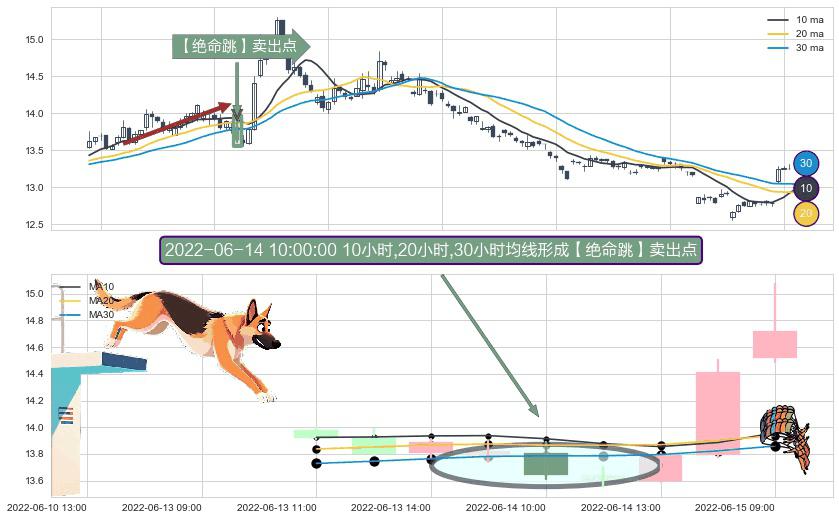 形态多维评估: ⚀ 2022-06-14 10:00:00小时显现 10小时-20小时-30小时均线 【绝命跳】卖出点 看空信号,后市看跌,卖出
