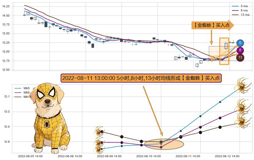 形态多维评估: ⚀ 2022-08-11 13:00:00小时显现 5小时-8小时-13小时均线 【金蜘蛛】买入点 看多信号,后市看涨,买入