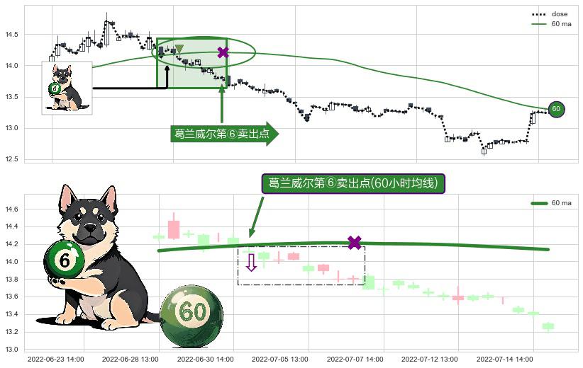形态多维评估: ⚀ 2022-07-01 13:00:00-小时显现 葛兰威尔均线 60小时均线 第⑥卖出点 走势反转见顶信号,后市看跌,卖出信号