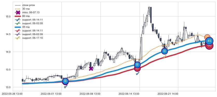 上涨趋势05-26 13:00-06-30 14:00,均线60, 45确认关键支撑3处