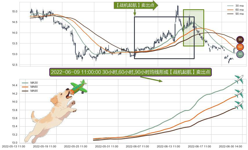 形态多维评估: ⚀ 2022-05-26 10:00:00小时-2022-06-28 14:00:00小时显现 30小时-60小时-90小时均线 【战机起航】卖出点 看空信号,后市看跌,卖出