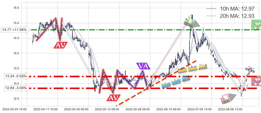 ♘ 阻力价格位14.77,可信任强度62.32%,距离最后交易2022-08-12 14:00形成的收盘价格13.24相差 +11.56%