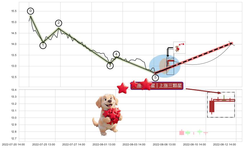 从2022-08-05 13:00至2022-08-12 14:00,共包含12个小时,阶段股价上涨4.47%,阶段股价变动位移路程比: 1 : 1.2
