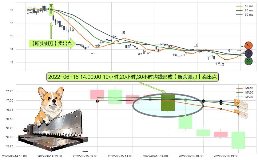 ⚀ 2022-06-15 14:00:00小时显现 10小时-20小时-30小时均线 【断头铡刀】卖出点 看空信号,后市看跌,卖出