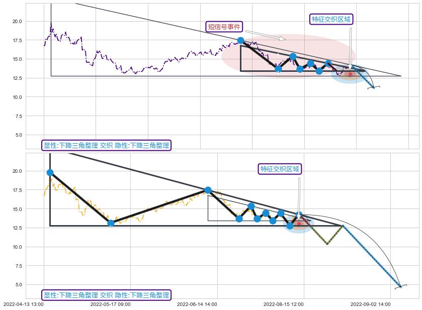 | 2 🅚:下跌螺旋桨 ➕ 📐:下降三角整理下行突破支撑位破位, 猜想持续下沉下跌,被突破的支撑位已变为阻力位 ☞ 看空信号 ⇥ 【🅚线】交织【图形】⇥ 综合量化分数: 47 | > |