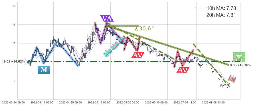 ➣ 【已确认突破】最后价格:7.87与最小【反转】第一目标价格→(08-22:13: 6.64 )相较: 下跌空间【中等】