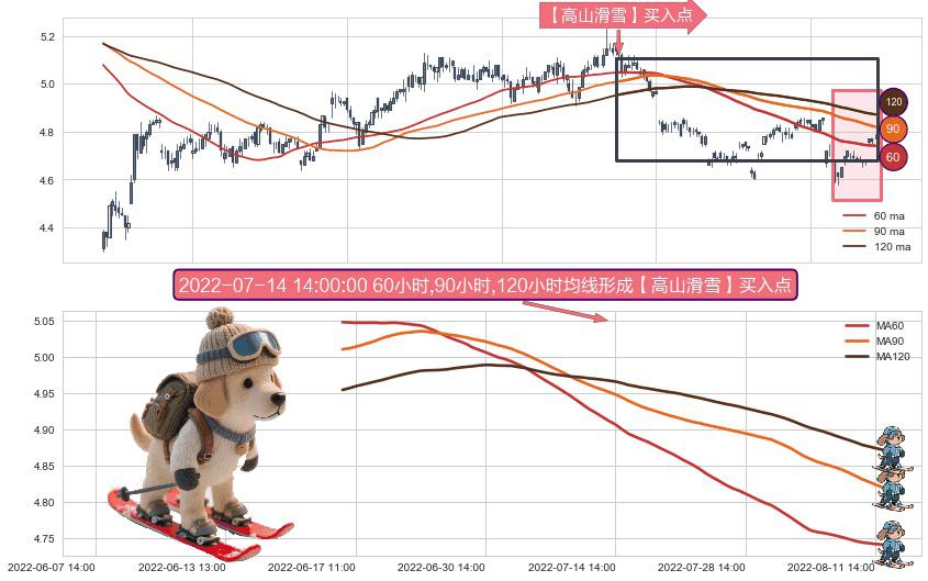⚀ 2022-06-17 09:00:00小时-2022-08-12 13:00:00小时显现 60小时-90小时-120小时均线 【高山滑雪】买入点 看多信号,后市看涨,买入