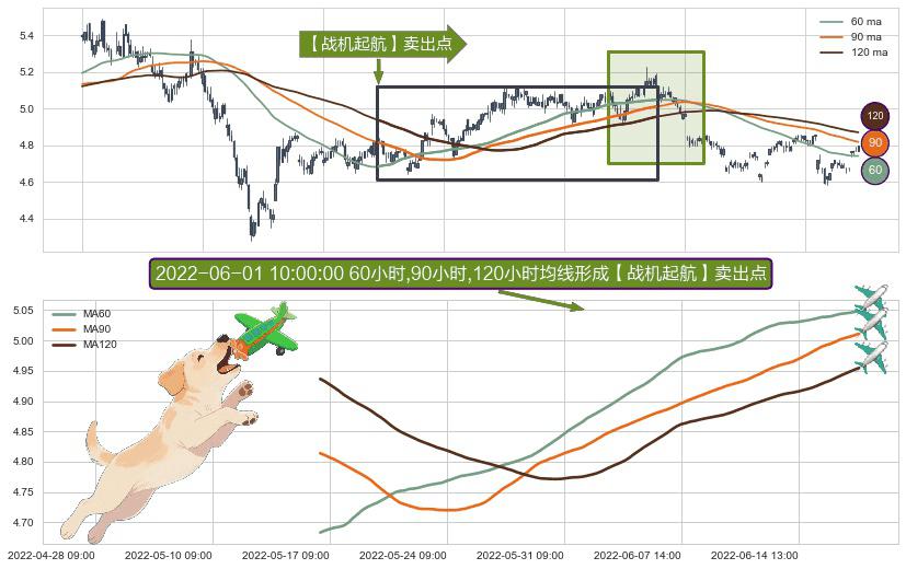 ⚀ 2022-05-16 13:00:00小时-2022-06-17 09:00:00小时显现 60小时-90小时-120小时均线 【战机起航】卖出点 看空信号,后市看跌,卖出