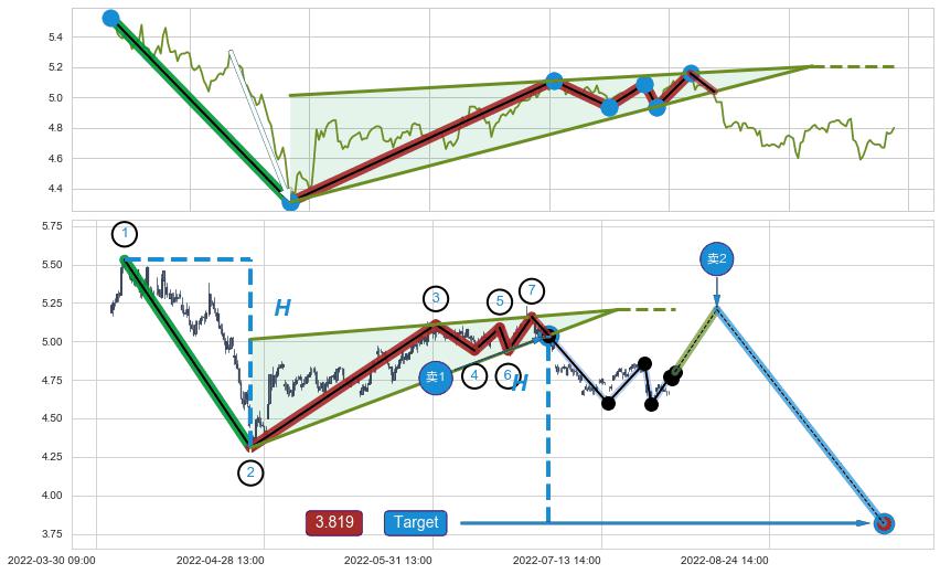 ➣ D点拟合预测价格5.75,距离最后交易收盘价格4.80相差 +19.89%