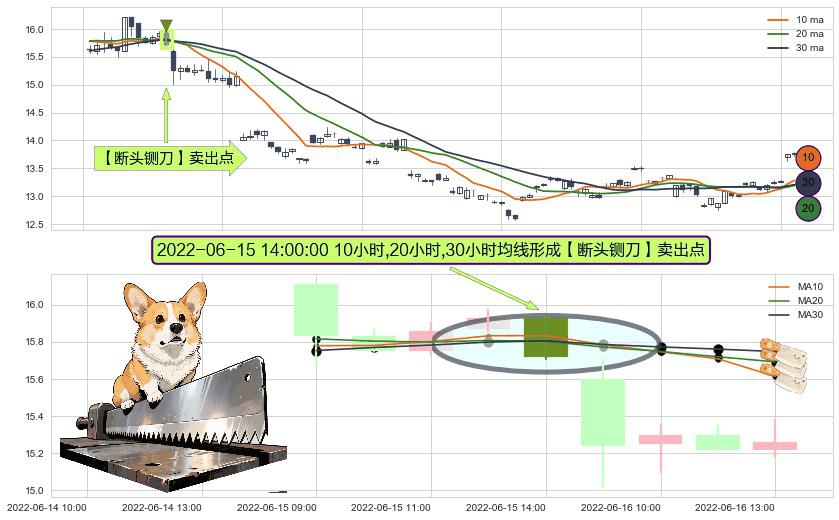 ⚀ 2022-06-15 14:00:00小时显现 10小时-20小时-30小时均线 【断头铡刀】卖出点 看空信号,后市看跌,卖出