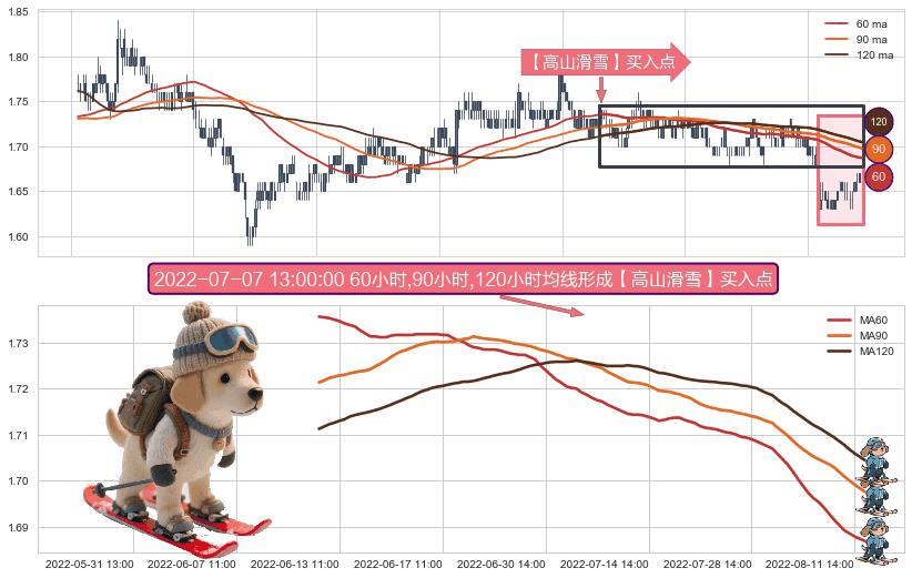 ⚀ 2022-06-10 13:00:00小时-2022-08-12 14:00:00小时显现 60小时-90小时-120小时均线 【高山滑雪】买入点 看多信号,后市看涨,买入