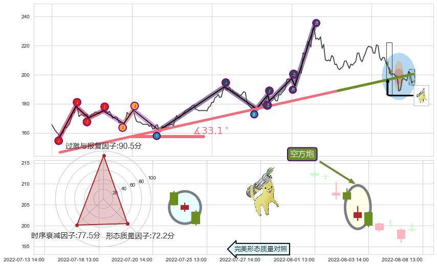 ➣ 2022-05-09 13:00-2022-07-12 13:00上升趋势存在反转[风险],虽然原上升趋势的支撑位(200.47)已破位,但其支撑效果尚存,原上升趋势角度: 33.1˚